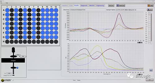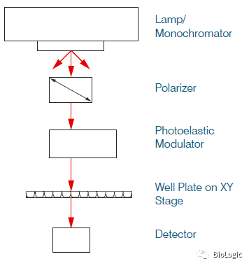 這項(xiàng)圓二色CD技術(shù)的突破是通過將一般圓二色CD光譜儀的光路配置進(jìn)行轉(zhuǎn)換完成的。在傳統(tǒng)CD(臥式)中,光路的配置使得光束水平穿過裝滿溶液的比色池。通過將光路垂直配置,CD Microplate ReaderTM圓二色譜微孔板檢測儀/酶標(biāo)儀可以直接測試孔板中的樣品溶液。通過XY運(yùn)動臺進(jìn)而可以移動孔板測試所有孔的樣品。
