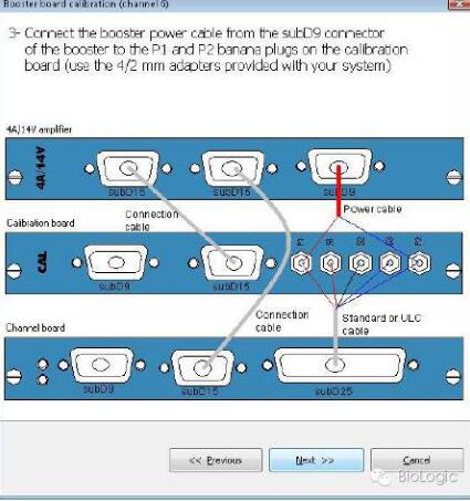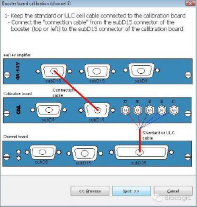 2.將電流放大器與校準(zhǔn)板用測(cè)試線和兩個(gè)DB15連接起來,如圖所示,然后點(diǎn)擊“Next”鍵。