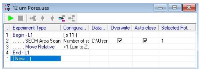 一旦選定合適的孔,在不同高度對其進行面掃描。所有面掃描均在50x50μm2的面積上進行,X和Y的步長為1μm,運行時間約為11.5分鐘。使用SECM150定序選項(在New Experiment菜單中提供)進行掃描。在進行每個面掃描后,探針在Z中自動向上移動相對于其最后位置1μm。這是作為一個自動回路形成的,共有11個操作,如圖4所示。