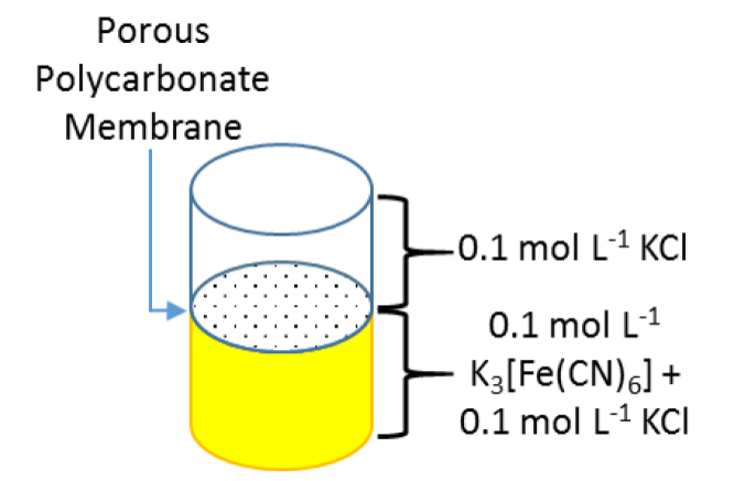 其中:rp是孔隙半徑;Cd是施主溶液中的[Fe(CN)6]3-濃度,mol cm-3;Cr是受主溶液中的[Fe(CN)6]3-濃度,mol cm-3;l是孔隙的長度(膜的厚度)。用此公式獲得最大電流為-45nA。這意味著收集效率低于50%。這一差異是可以預(yù)料的,并且很可能會產(chǎn)生,因為進行了許多假設(shè),包括整個孔是完全圓柱形的,膜厚度沒有不確定性,所有從孔中冒出的[Fe(CN)6]3-都由探針收集,由于尖端尺寸這是不太可能的,探針樣品距離正好是0[4]。