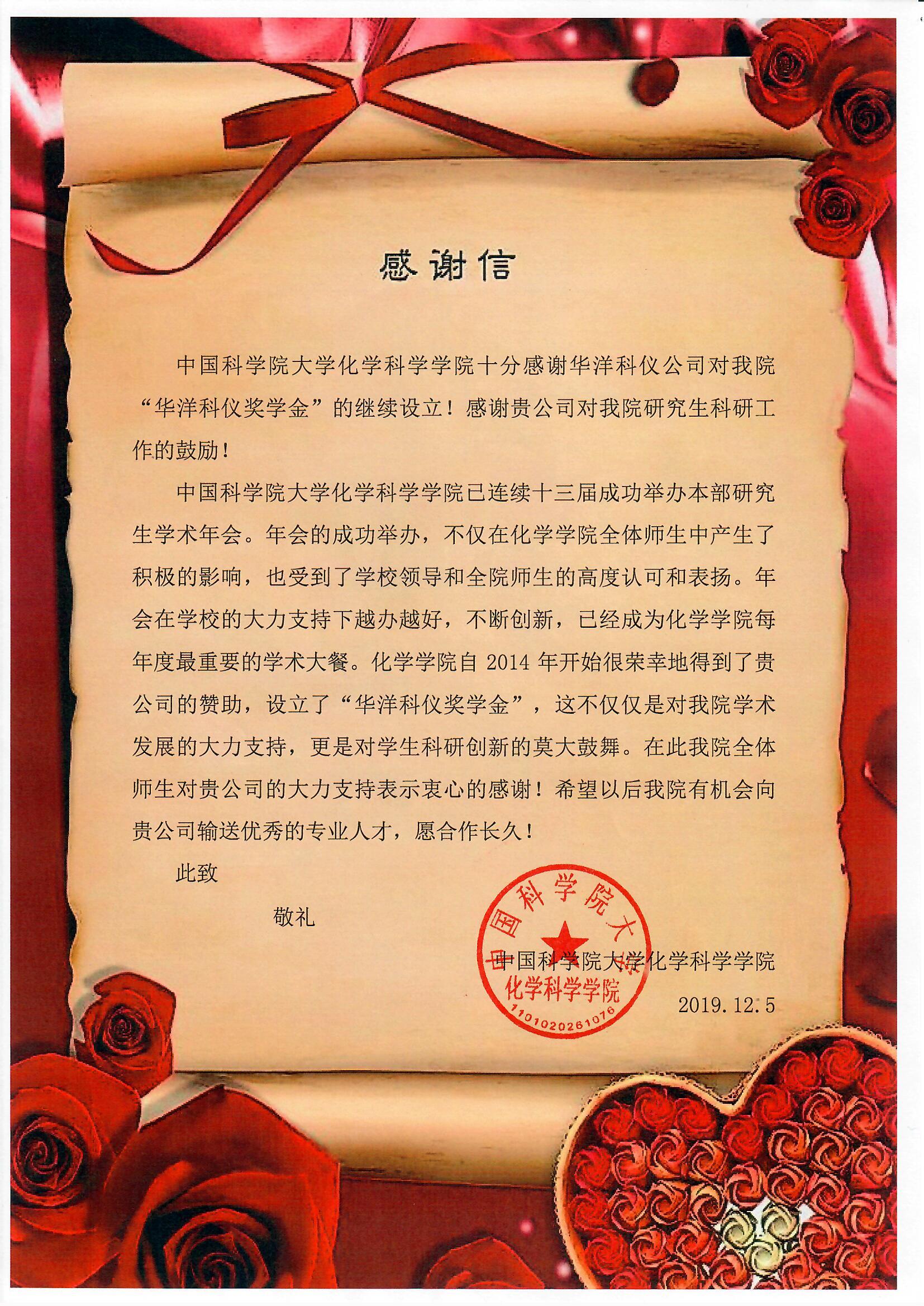 華洋科儀于2014年開始贊助中國科學(xué)院大學(xué)化學(xué)科學(xué)學(xué)院,設(shè)立了“華洋科儀獎學(xué)金”,我司大力支持化學(xué)科學(xué)學(xué)院的學(xué)術(shù)發(fā)展,鼓舞化學(xué)科學(xué)學(xué)院的學(xué)術(shù)科研創(chuàng)新。對此,化學(xué)科學(xué)學(xué)院全體師生對我司表示衷心的感謝!希望以后有機(jī)會向我司輸送優(yōu)秀的專業(yè)人才,愿合作長久!