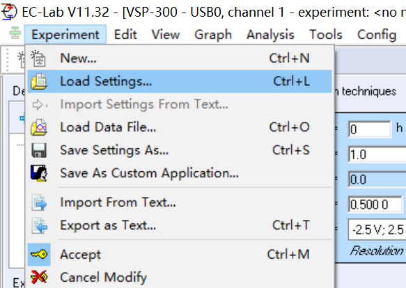 還是以上面的腐蝕實驗為例,調(diào)用實驗設(shè)置的方法為:EC-Lab軟件中Experiment→Load Settings...→彈出打開文件路徑對話框→選擇上次保存的參數(shù)設(shè)置文件即可。這樣一步操作,就可以直接添加了OCV、EIS、LSV實驗,并且實驗參數(shù)設(shè)置也與上次實驗的設(shè)置一致。如果實驗參數(shù)或者實驗方法需要調(diào)整,可以直接更改?;蛘弑4娑鄠€實驗設(shè)置,每次需要做哪個類型的實驗,就直接調(diào)用該類型的實驗設(shè)置即可。