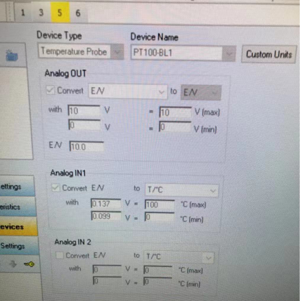 其中,Device Type選擇“Temperature Probe”,Device Name選擇“PT100-BL2”。(“PT100-BL1”是BioLogic早期的一款溫度探針,現(xiàn)已停產(chǎn)。)下方的Analog OUT和Analog IN1兩部分參數(shù)都是自動(dòng)定義的,不需要設(shè)置。