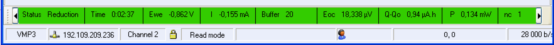 狀態(tài)欄底色出現綠色,是與黃色相對的,代表此時實驗測試的過程為還原過程或者放電過程。比如CV測試中,還原反應階段,軟件狀態(tài)欄就顯示綠色;或者GCPL過程中,放電過程狀態(tài)欄也顯示為綠色。