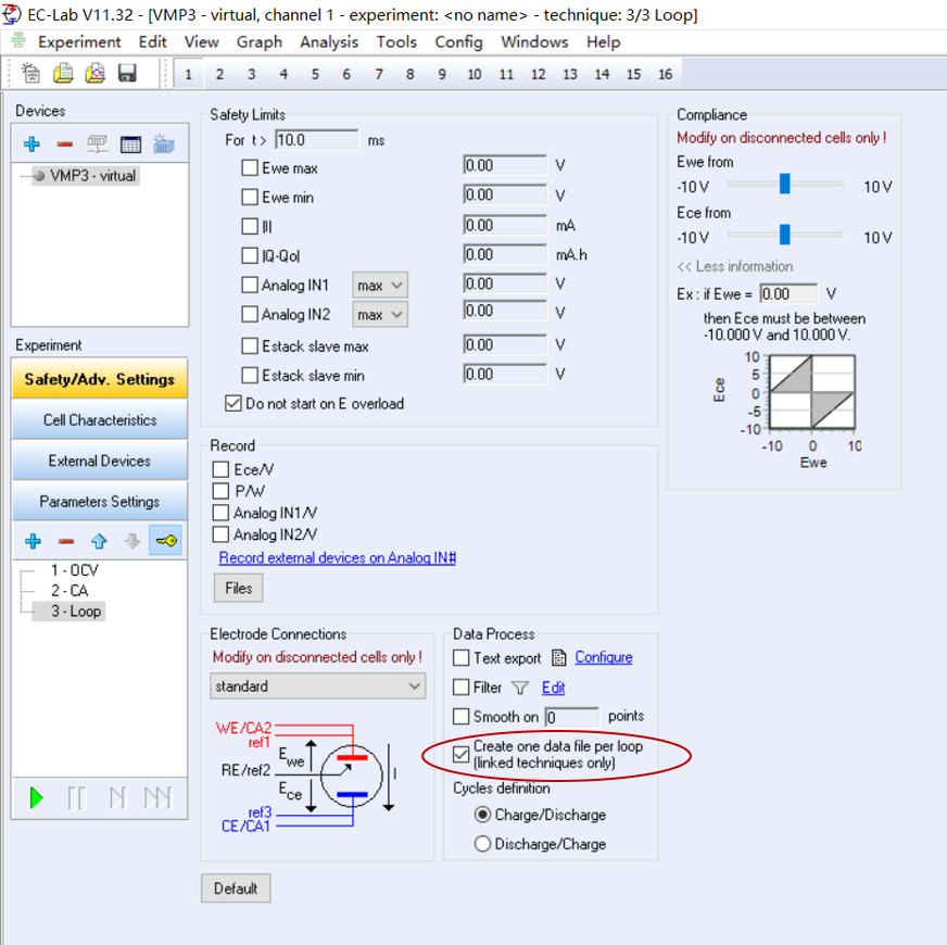 然而,為了更方便的處理數(shù)據(jù),有些用戶可能希望將每一圈的數(shù)據(jù)都分開保存為一個(gè)文件。在EC-Lab文件中可以實(shí)現(xiàn)這個(gè)功能。如下圖,以EC-Labv11.32為例,在Safety/Adv. Settings下的Data Process部分,選擇Create one data file per loop(linked techniques only)。選擇該選項(xiàng)后,上面列舉的實(shí)驗(yàn)結(jié)束后,存儲(chǔ)的實(shí)驗(yàn)數(shù)據(jù)為20個(gè).mpr文件:10個(gè)OCV實(shí)驗(yàn)數(shù)據(jù),10個(gè)CA實(shí)驗(yàn)數(shù)據(jù)。