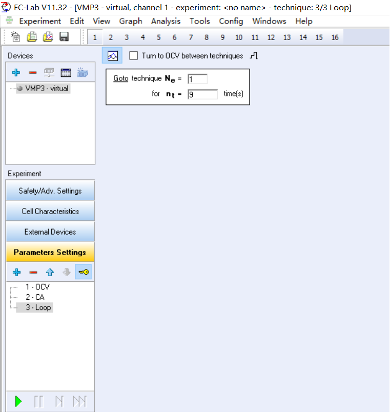 比如,在某個(gè)實(shí)驗(yàn)中,需要先運(yùn)行一個(gè)OCV,然后運(yùn)行CA,然后運(yùn)行Loop到OCV實(shí)驗(yàn)9次。如下圖。