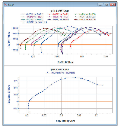 下圖例子展示了電池模組的EIS交流阻抗測(cè)試結(jié)果。實(shí)驗(yàn)方法為PEIS。在這個(gè)實(shí)驗(yàn)中,主通道控制10個(gè)元件組成的模組的電位,并測(cè)量流過整個(gè)模組的電流。整個(gè)模組的交流阻抗譜圖顯示于底部的曲線圖,各個(gè)原件的交流阻抗譜圖則疊加顯示于頂部的曲線圖。在這個(gè)實(shí)驗(yàn)中僅需要6個(gè)測(cè)試通道:1個(gè)作為主通道,其余5個(gè)作為從通道。