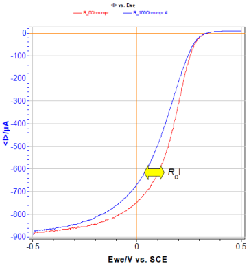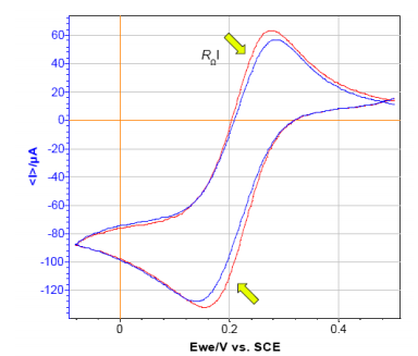 同樣,在循環(huán)伏安中歐姆降也會對數(shù)據(jù)結(jié)果產(chǎn)生影響。