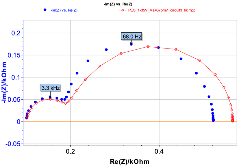 使用K-K轉換計算的阻抗ZKK如圖3所示。這兩個阻抗圖不同,表明阻抗測量是在非線性條件下進行的。