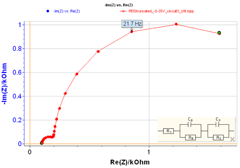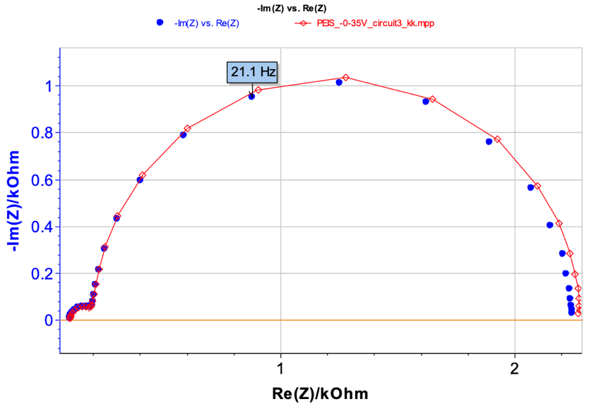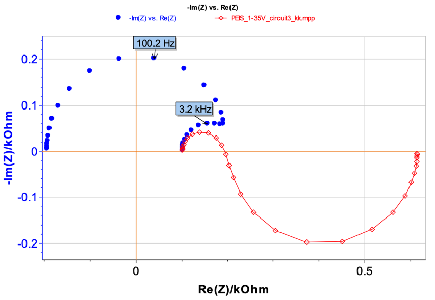 圖6: Test-box 3,PEIS在圖1的b點測得的Nyquist圖(EWE = 1.35 V, Va = 10 mV, fmin = 1 Hz, fmax = 100 kHz(藍線))以及K-K轉換獲得的Nyquist圖(紅線)