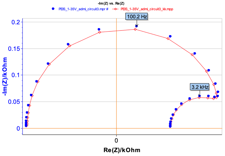 圖2: Test-box 3 在圖1中a點對應的PEIS測得的Nyquist圖(EWE = -0.35 V, Va = 10 mV, fmin = 0.2 Hz, fmax = 50 kHz(藍線))以及K-K轉換獲得的Nyquist圖(紅線)