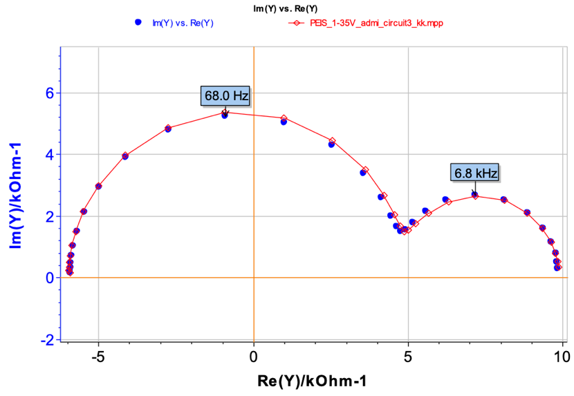 圖11顯示了Y導納圖和YKK導納圖之間的良好一致性,以及鎳電極在酸性介質中測量阻抗的一致性。導納圖之間的偏移是由于f→∞的阻抗實部的測量誤差引起的。