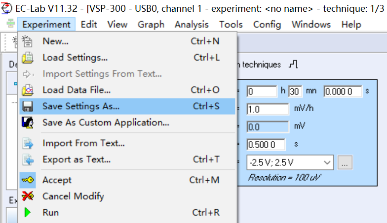 還是以上面的腐蝕實(shí)驗(yàn)為例,添加、設(shè)置實(shí)驗(yàn)后,保存參數(shù)設(shè)置的方法為:EC-Lab軟件中Experiment→Save Settings As...→彈出保存路徑對(duì)話框→設(shè)置文件名保存即可。