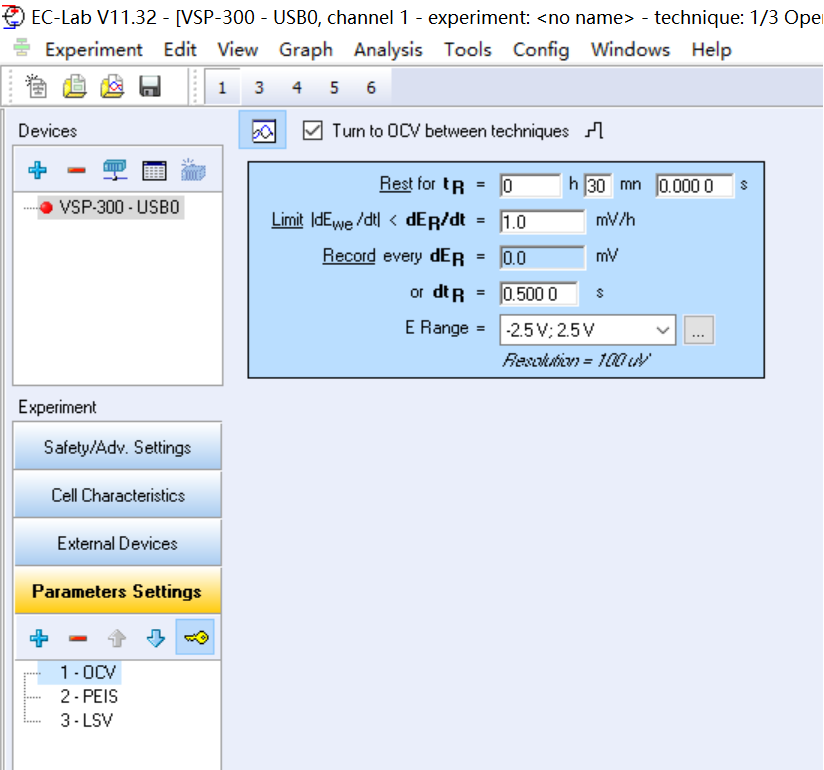 用戶在第一次實(shí)驗(yàn)時(shí),需要按照需求,在EC-Lab中添加所需的實(shí)驗(yàn),并對(duì)每個(gè)實(shí)驗(yàn)進(jìn)行參數(shù)設(shè)置。以一般的腐蝕測(cè)試為例,下圖為一個(gè)樣品需要進(jìn)行的一系列測(cè)試,先做一個(gè)OCV,然后是EIS測(cè)試,最后是LP測(cè)試。