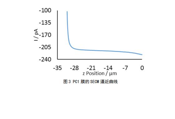 用于SECM測(cè)試的探針的直徑非常小,任何SECM測(cè)試中,調(diào)平樣品都是獲得最佳實(shí)驗(yàn)結(jié)果的關(guān)鍵因素。為了獲得更好地實(shí)驗(yàn)結(jié)果,探針到樣品的距離要小于探針直徑的三到五倍[1]。所以對(duì)于直徑25?m的探針,探針到樣品的距離最大為125?m,而對(duì)于直徑1?m的探針,探針到樣品的距離應(yīng)小于等于5?m。而且,為了獲得最佳結(jié)果,測(cè)試距離可以更小,甚至小于探針直徑[2]。這就要求樣品的傾斜度對(duì)25?m的探針測(cè)量不能產(chǎn)生影響,對(duì)1?m的探針的影響也要極低,甚至沒(méi)有影響。圖3為0.5?m探針在PC1薄膜上的逼近曲線。由逼近曲線可以看出,探針電流的變化只發(fā)生在2.5?m內(nèi)。使用直徑≤5?m的探針進(jìn)行測(cè)試時(shí),進(jìn)行樣品調(diào)平是非常必要的。所以實(shí)驗(yàn)開(kāi)始前,要用調(diào)平螺母和水平儀調(diào)平樣品。測(cè)試裝置安裝完成后,可以通過(guò)測(cè)試區(qū)域四個(gè)角的逼近曲線來(lái)進(jìn)一步判斷樣品的傾斜度。如果傾斜差異大于探針直徑的三倍,需要抬高探針,重新調(diào)平樣品。這樣反復(fù)調(diào)平,直到傾斜度在可接受范圍內(nèi)。