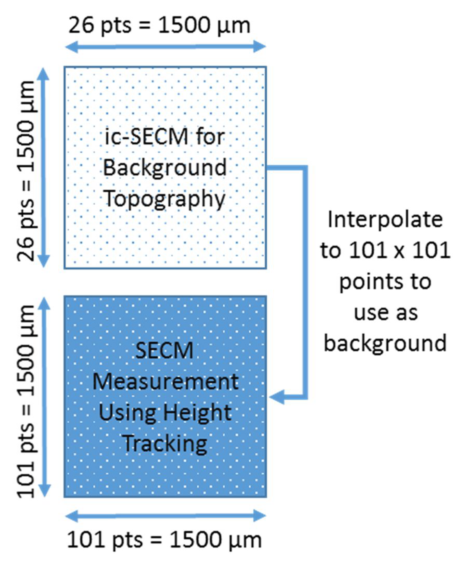 SECM測(cè)試前要先測(cè)試樣品形貌??梢酝ㄟ^(guò)M470或M370的任何可以輸出形貌數(shù)據(jù)的技術(shù)進(jìn)行測(cè)試(ic-SECM、OSP、CHM或CTM),測(cè)試面積、步長(zhǎng)、點(diǎn)數(shù)等信息都要與SECM測(cè)試一致。為了調(diào)整z軸位置,高度追蹤只能采用單步測(cè)試模式。