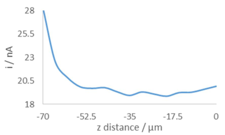 圖4為樣品上最大的石墨薄片上的逼近曲線,可以看出其為正反饋,說(shuō)明樣品為導(dǎo)體??梢酝ㄟ^(guò)SECM測(cè)試薄片和基體Si/SiO2的差異。