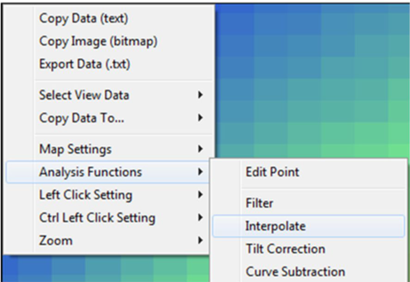 由于形貌測(cè)量點(diǎn)數(shù)與最終測(cè)量的差異,可以通過(guò)差值法使樣品形貌測(cè)試結(jié)果的點(diǎn)數(shù)符合最終測(cè)量的點(diǎn)數(shù)??梢酝ㄟ^(guò)在形貌測(cè)試圖上右鍵,選擇“Analysis Functions”來(lái)實(shí)現(xiàn),如圖2所示。當(dāng)形貌圖通過(guò)插值法獲得理想點(diǎn)數(shù)后,可用于SECM的高度追蹤測(cè)試中,如圖3所示。