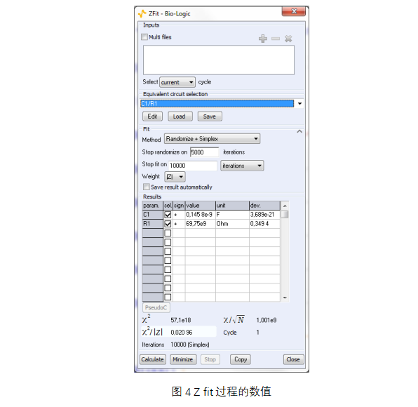 SPEIS7MHz-1Hz允許用戶使用Zfit工具在不同頻率下擬合電容值C1(頻率選擇窗口如圖7所示)。圖8中的C1與實(shí)驗(yàn)中已經(jīng)計(jì)算的Cp值進(jìn)行了比較。C1和Cp在低電壓下的值約為140 pF,在高電壓下的值約為20 pF。因此,比較表明,用Zfit計(jì)算的C1和直接在EIS技術(shù)中確定的Cp是相同的。