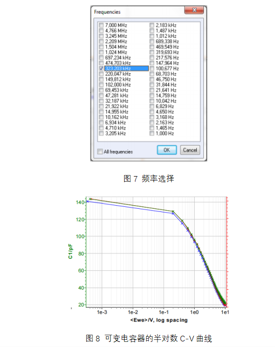 采用了兩種SPEIS技術(shù)。一個(gè)在7 MHz到1 Hz的頻率范圍內(nèi)(設(shè)置如圖5所示),另一個(gè)在一個(gè)頻率下(設(shè)置與圖5所示類似,fi等于ff)。在323 kHz的頻率下進(jìn)行測(cè)量,因?yàn)樵谠擃l率以上,可變電容器的響應(yīng)取決于頻率(圖6)。這些實(shí)驗(yàn)分別命名為SPEIS7MHz 1Hz和SPEIS323kHz。電壓掃描從0 V開(kāi)始,以200 mV的步長(zhǎng)上升到10 V。