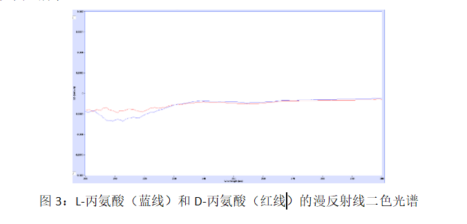漫反射線二色的信號強度中,L-丙氨酸的低于0.0008 △A,D-丙氨酸的低于0.0005 △A,這樣的強度對CD測量幾乎沒有影響。與其他制造商報告的值相比,我們設(shè)計的儀器更好,線二色效應(yīng)對比其他機器小4-5倍。