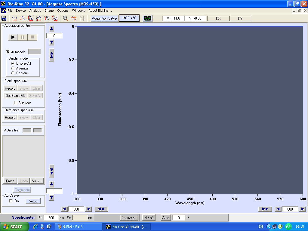 1.空白的測量。將裝有待測樣品的空白(如水或緩沖鹽)的石英比色池放入樣品室,蓋上蓋子(所用的石英池必須經(jīng)過徹底的清洗,如有殘留物將會干擾測試結(jié)果)。點擊圖2主界面Blank spectrum區(qū)域的Record按鈕,進行空白譜掃描,空白譜以白色虛線的形式顯示在主界面中。在測好空白譜的基礎(chǔ)上勾選Subtract復(fù)選框,這個選項的功能是軟件將在下一步樣品的測量中自動扣除空白。另外,通過點擊save as按鈕可以將空白譜保存成文件。