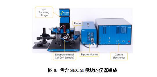 如圖8所示,SECM由許多部件組成。為了滿足x,y,z方向的掃描,SECM都有一個x,y,z掃描平臺,能夠達到最高分辨率測量所需的亞微米級步長。雖然反饋模式只要求探針有偏壓,需要一個單一的恒電位儀測量,但SECM在其他模式下進行時,也要求樣品作為第二工作電極有偏壓。因此,SECM都使用雙恒電位儀。樣品放置在工作臺上的一個電化學電解池中,為調(diào)整樣品的傾斜度做了準備。最后,SECM需要使用UME探針,其通常作為測量中的主要工作電極。