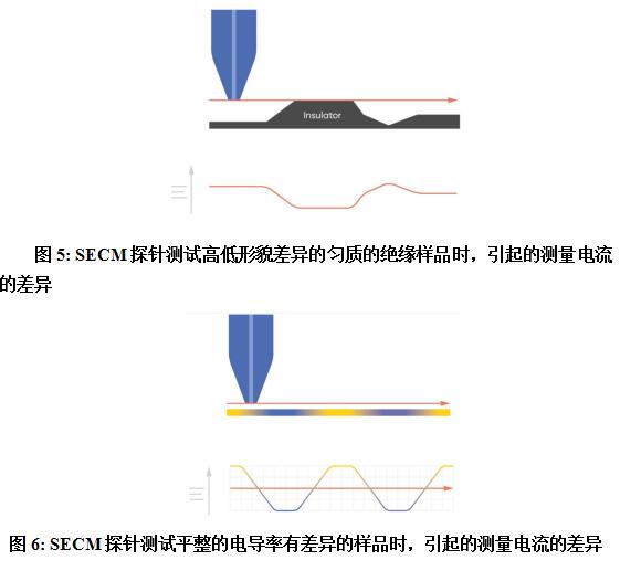 隨著探針到絕緣樣品間隙的減小,介質(zhì)擴散受阻的程度增加。這導(dǎo)致絕緣體上探針到樣品的距離減小時,電流的絕對值減小。另一方面,隨著探針到導(dǎo)電樣品間隙的減小,來自樣品的正反饋增加,導(dǎo)致導(dǎo)體上探針到樣品的距離減小時,電流的絕對值增加。圖4中對比了這些響應(yīng)。通過比較可以看出,兩種樣品性質(zhì)對掃描電化學顯微鏡測量的信號有影響:(1)樣品活性;(2)樣品形貌。如果考慮兩種不同的樣品類型,一種是具有高低形貌變化的均勻絕緣樣品,另一種是具有非均勻活性的完全平坦樣品,則可以進一步證明這些不同的對比度。這兩種樣品類型都會顯示SECM探針信號的變化,但原因不同。當測量具有高低形貌變化的均勻絕緣樣品時,探針到樣品的距離在整個測量過程中發(fā)生變化。這導(dǎo)致由于絕緣體處的負反饋而使電流信號絕對值高于谷值,低于峰值,如圖5所示。對于具有活性變化的完全平坦樣品,還可以看到電流信號的波動。在這種情況下,探針到樣品的距離在整個測量過程中保持不變,因為探針從正反饋區(qū)域移動到負反饋區(qū)域,反之亦然,所測量的電流變化,在最活躍區(qū)域的電流的絕對值更高,如圖6所示。因此,對于非常粗糙的樣品,控制探針到樣品的距離進行SECM測量是有益的。有許多方法可以實現(xiàn)恒定距離的SECM,盡管本文不討論這些方法。