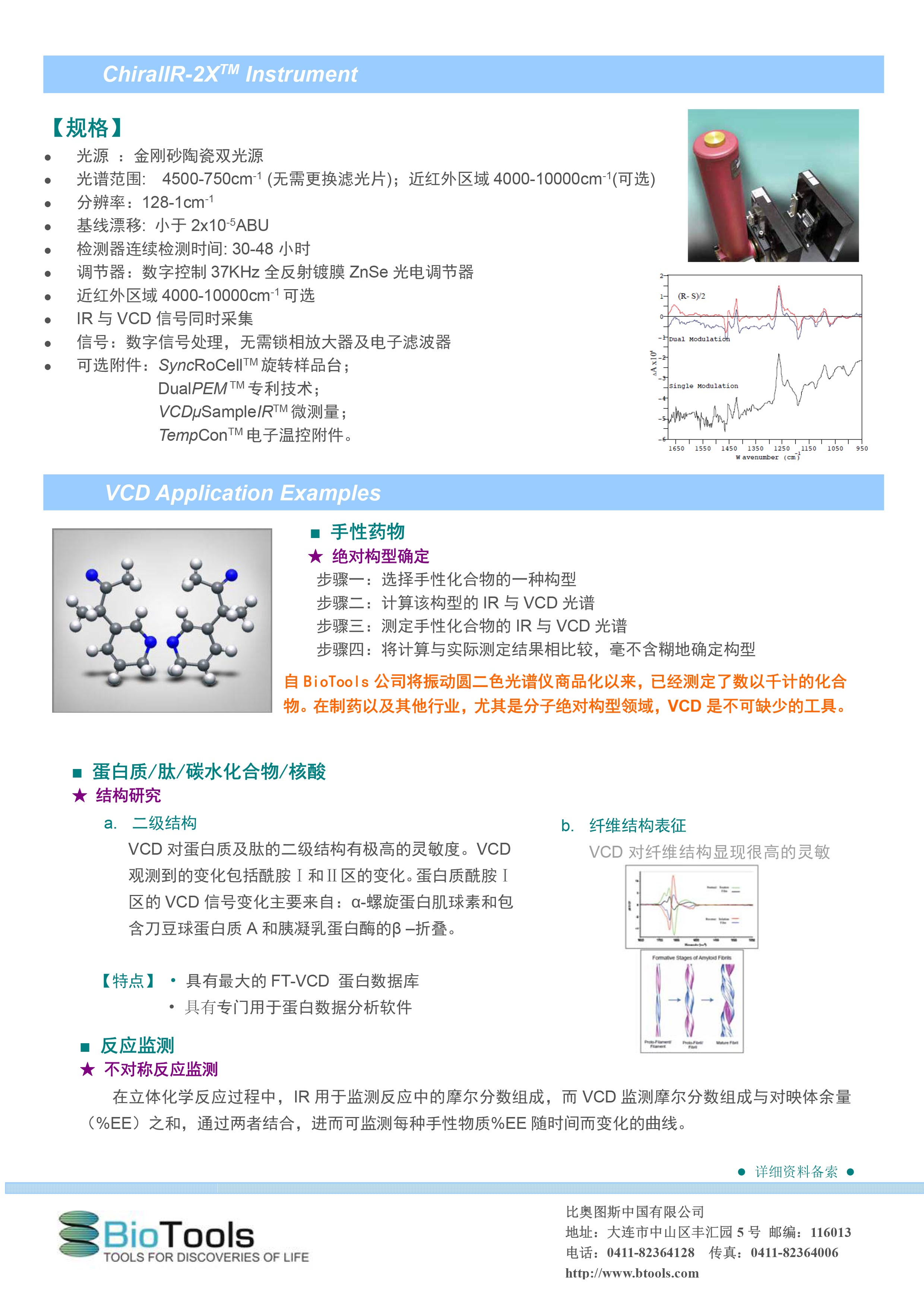 振動(dòng)圓二色光譜( VibrationalCircular Dichroism Spectrometer)首次于 1973 年測(cè)量,1997 年 BioTools 公司全球首次推出 Chrial/RTM 振動(dòng)圓二色光譜儀,從而將振動(dòng)圓二色光譜技術(shù)商品化.成為世界上第一家商業(yè)化專用 VCD 光譜儀的生產(chǎn)廠家,同時(shí)這一具有雄厚實(shí)力的專家技術(shù)團(tuán)隊(duì)在化學(xué)、生物領(lǐng)域里為用戶提供著無與倫比的權(quán)威的應(yīng)用支持。