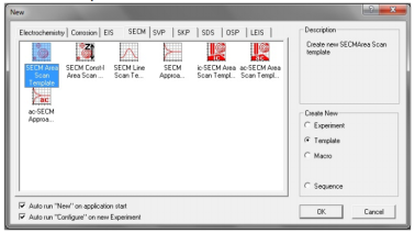 也可以創(chuàng)建用戶自己的模板,展示期望的參數(shù)和圖形。創(chuàng)建新模板,軟件需要連接M470工作站。點擊“New”,“New template”,如圖4所示。在我們的例子中,創(chuàng)建了一個新的“SECM Area Scan Template”。
