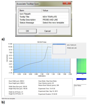 每一種類型的數(shù)據(jù)(ac-SECM、SVP、LEIS…)都有各自的預(yù)定義的模板,顯示預(yù)定義的數(shù)據(jù)。在圖1中的工具條中,“實驗配置”快捷按鈕(左數(shù)第三個)右側(cè)的前六個圖標是默認的模板,而后面三個是空的。他們可以作為數(shù)據(jù)分析的“便簽本”。